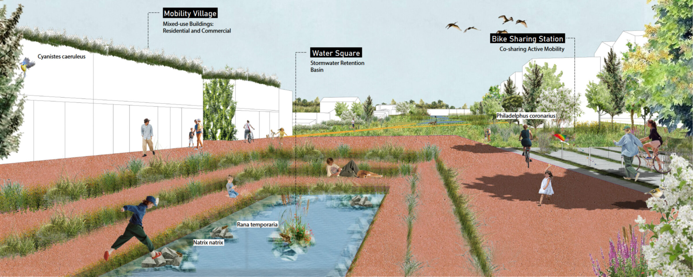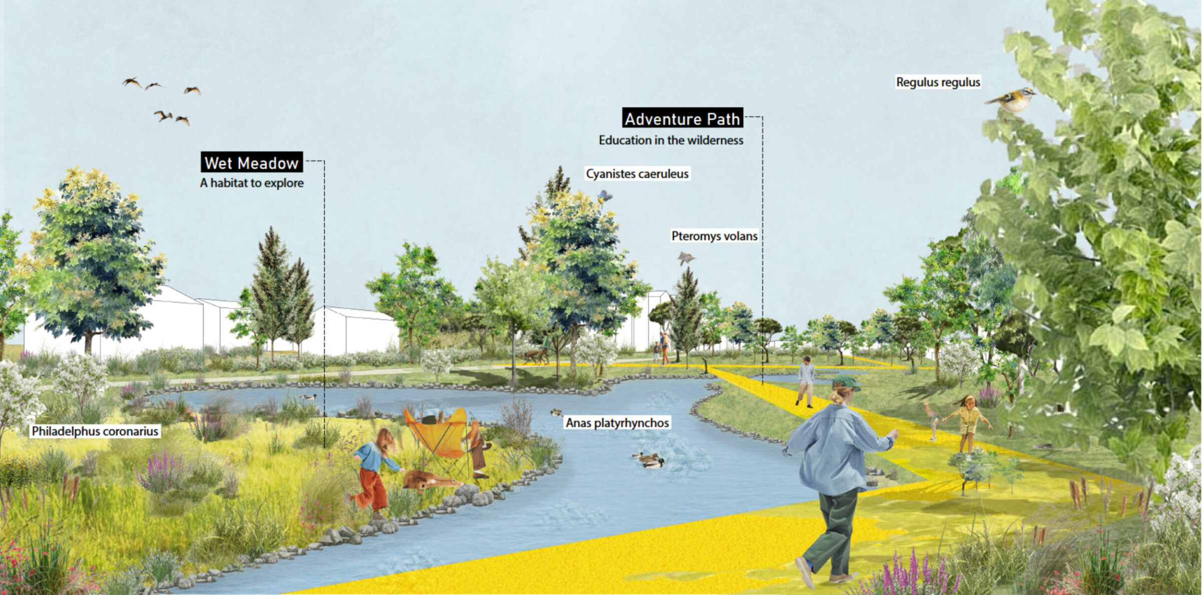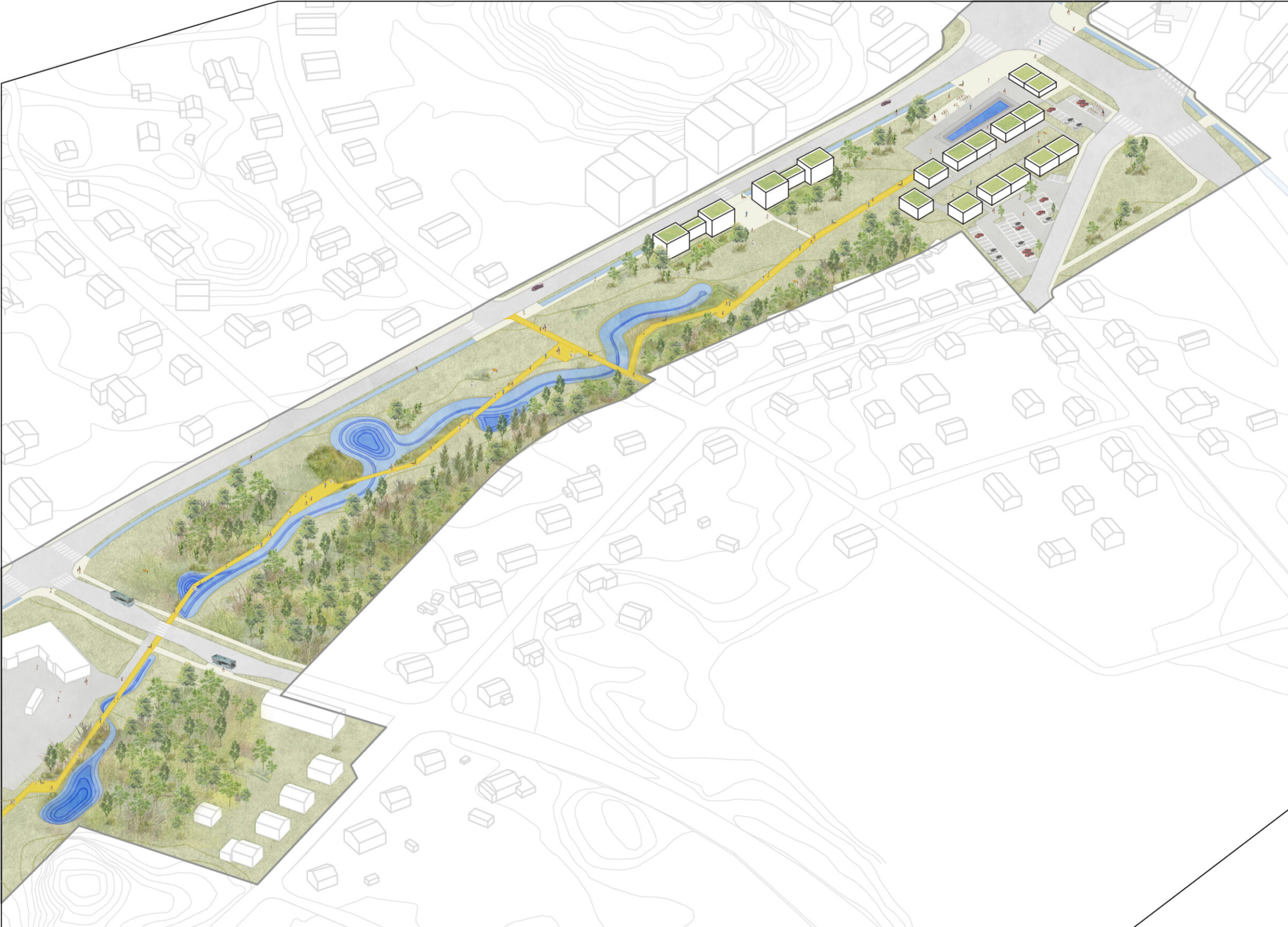 RE:wild is a prototype for sustainable urban transformation, turning a neglected industrial strip into a resilient, nature-first neighborhood. The project balances densification with ecological regeneration, creating diverse housing while restoring habitats and biodiversity. Green and blue infrastructure manages stormwater visibly and playfully. Mobility prioritizes walking and cycling with strong connections to Turku’s wider network, minimizing car use. A mix of housing integrates with adaptively reused industrial buildings, preserving local identity and reducing waste. Community spaces, public squares, and accessible wild zones foster recreation and inclusivity. RE:wild shows how cities can grow in socially inclusive, climate-resilient ways, creating neighborhoods that are not just livable, but regenerative.