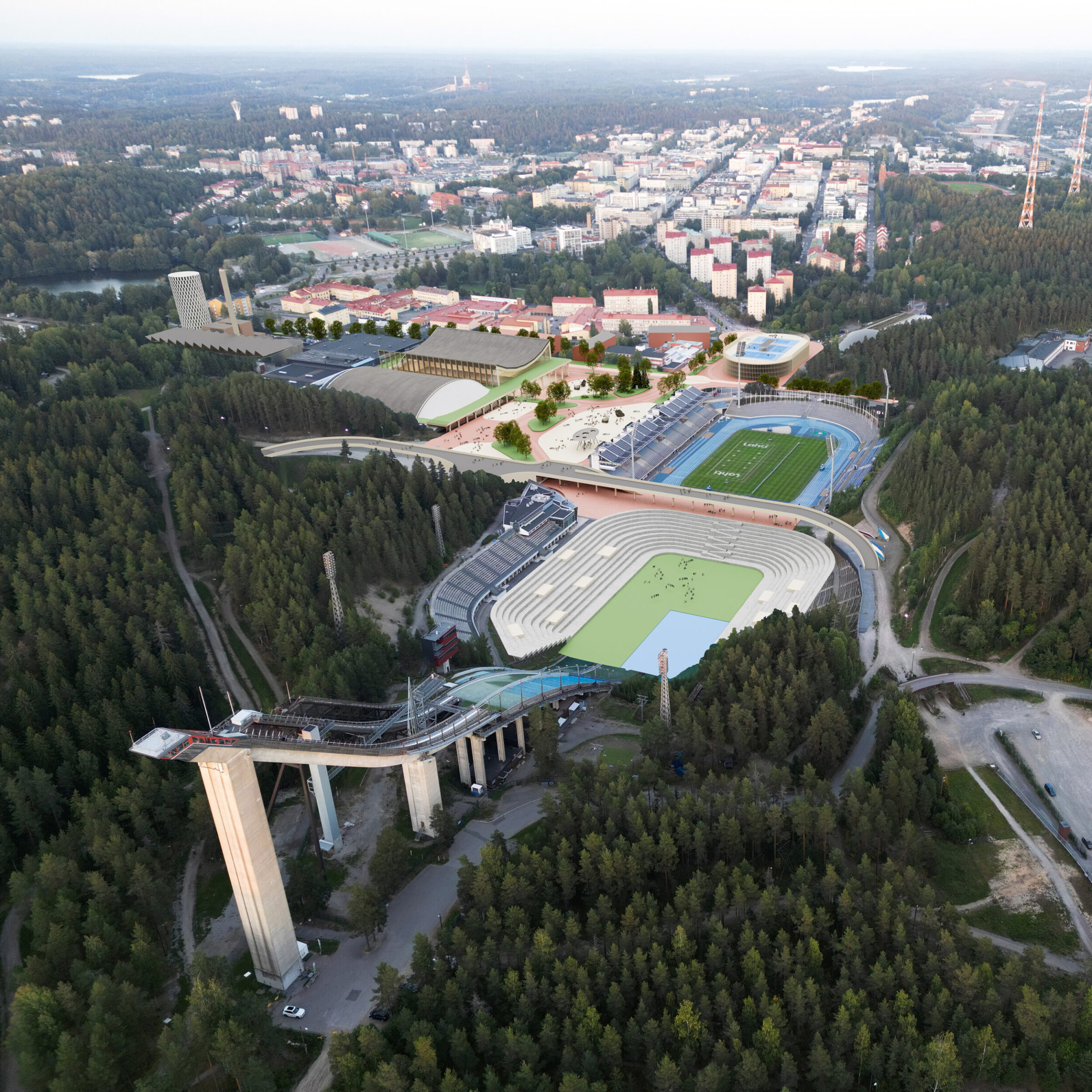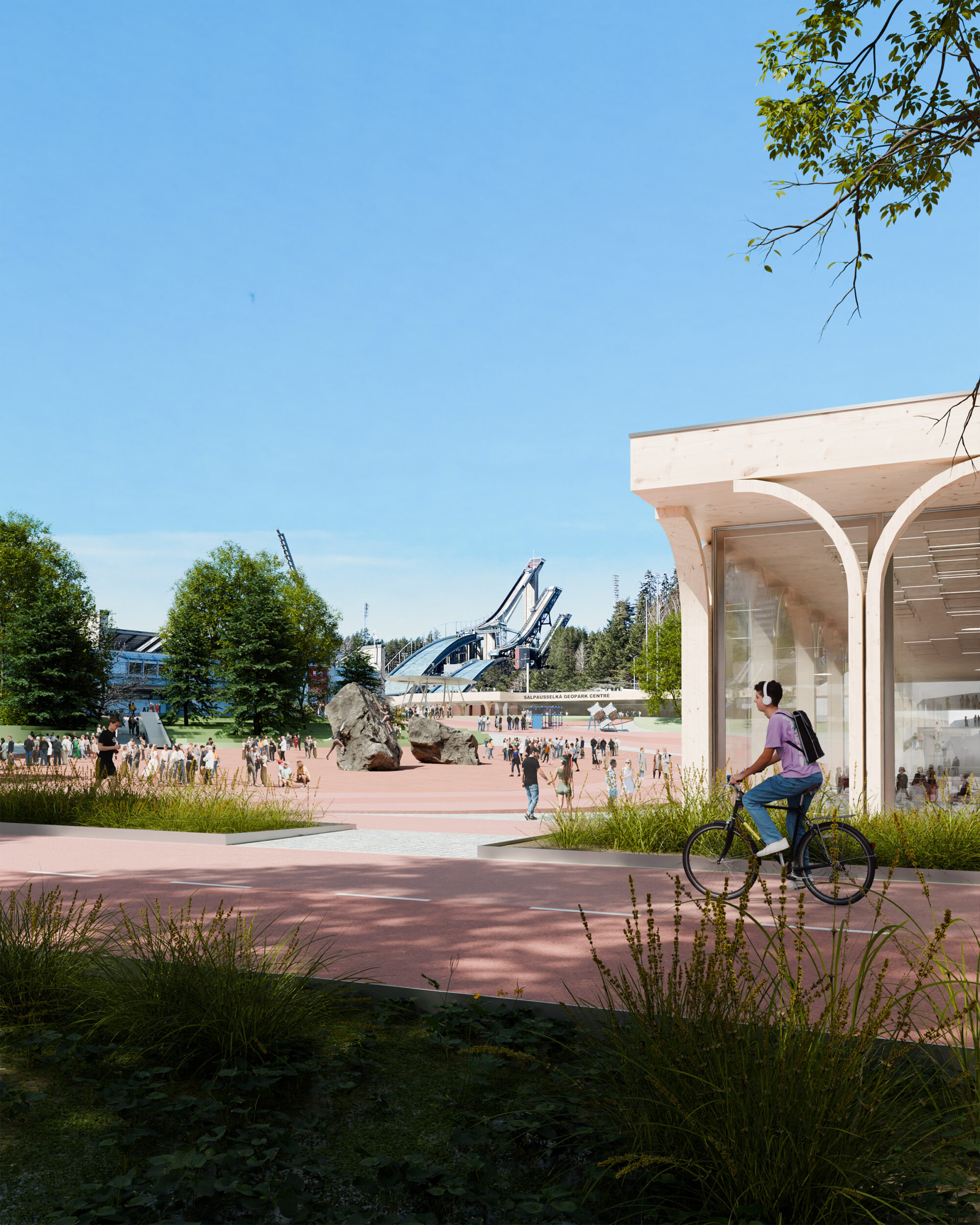 The plan brings together sports, events, daily activities, diverse nature, unique topography, built sustainably and inspired by the spirit of the ancient Olympic Games. Central Plaza forms the event area and a recreational park enriched with greenery. A new multipurpose arena with a façade of ski-like wooden pillars is situated next to Suurhalli. The Water Sports Centre, spa and a new hotel are located at the Teivaanmäki power plant. The ski jump stands are transformed into an amphitheatre, with a wooden bridge structure enabling free movement between the area’s functions. The Salpausselkä Geopark Centre is proposed next to the Ski Museum. In place of Isku Arena, an experimental self-sustaining housing concept is proposed. A wooden hybrid parking facility is built at the entrance.
