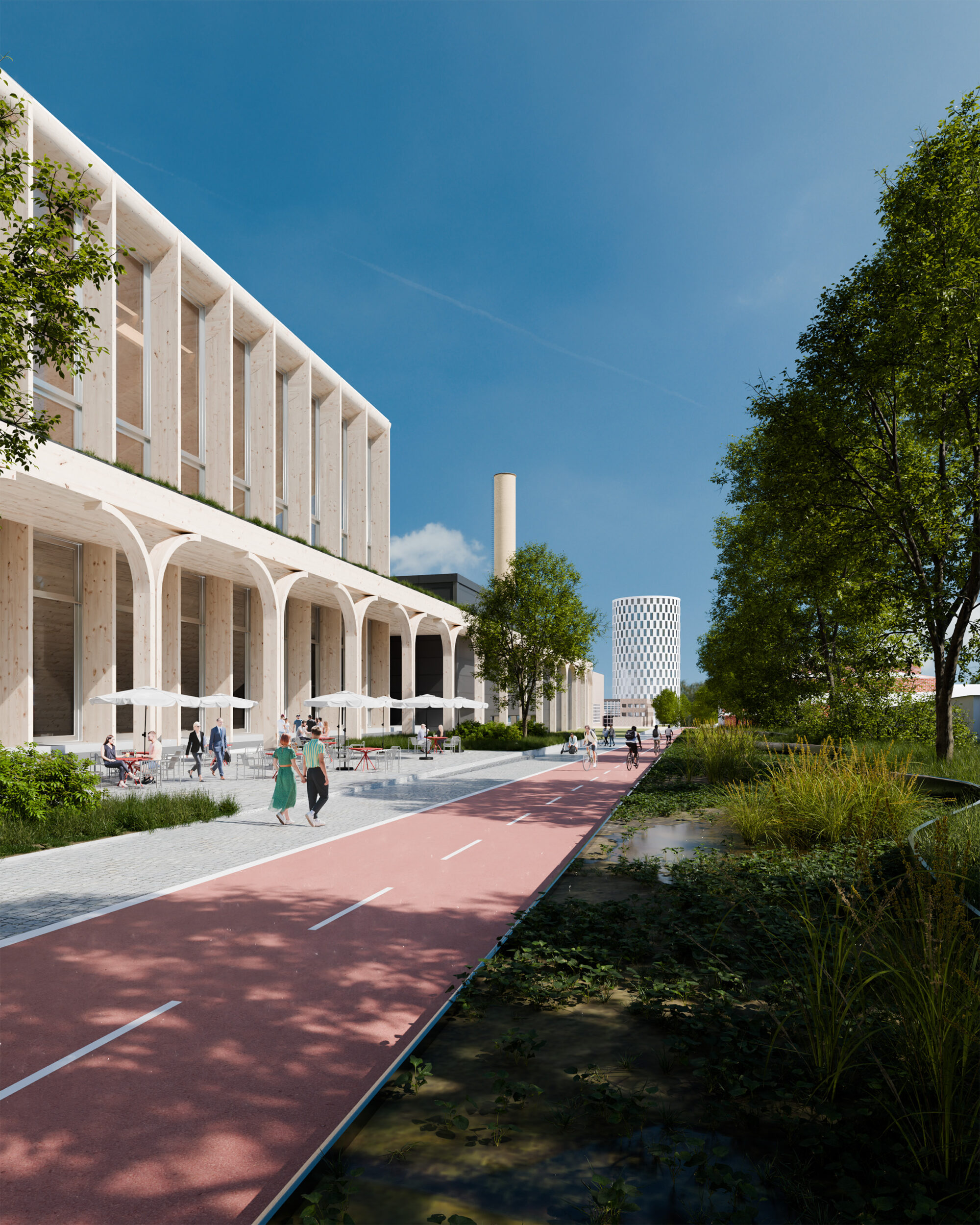 At the entrance area to the site, a hybrid parking building caters also for media use and a grocery store. In the more feasible Scenario B, the site has been identified as a possible location for the water sports centre.